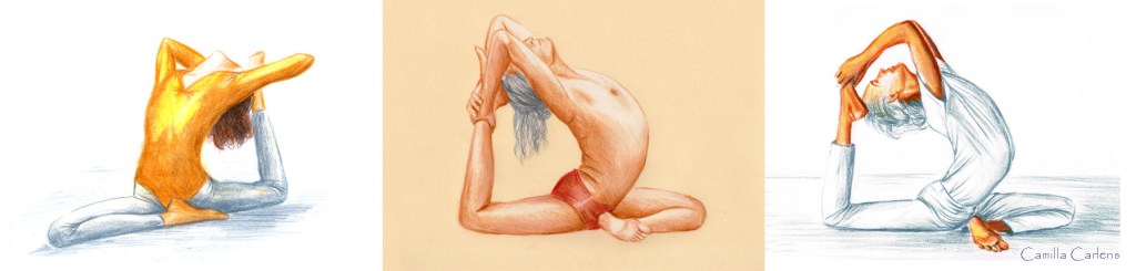 The pose of Heinz Grill shows two steps of kapotasana. First the legs create a horizontal line, then the body rises up. Heinz Grill performes the pose with a dynamic, that is graduated and articulated from the chest. Finally the circle unites head and feet. In his Pidgon Pose, the chest is the most dynamic centre of the body, arms and neck are more relaxed but maintain the clearlyness of the shape. BKS Iyengar creates the movement with accuracy, in one compleat movement. Narayani seems to move backwards lightly and easily, smooth, without a certain tension or dynamic or strength.