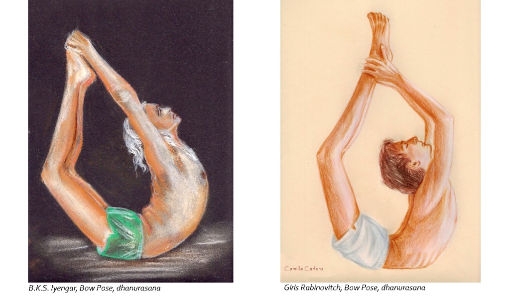 Iyengar´s bow is tensioned, chest and legs raise up, Giris Rabinovitch does not show this tension but a silent flexibility.