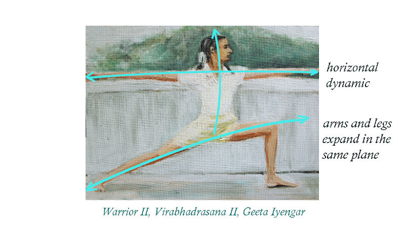 Warrior 2 is a standing pose. I´ve choosen Geeta Iyengar´s pose, because this pose expresses a straight direction and dynamic and demonstrates a well-ordered shape. The Legs as well as the arms create a horizontal dynamic. The legs make a big step and stand in a line. They seem to expand above the ground. the arms are parallel to the legs and spread straight into two opposite directions. Geeta gives a straight direction to the position of the legs as well as to the position of the arms. Legs and arms seem to be directed to an outer aim, it seems like they aspire an aim outside the body.