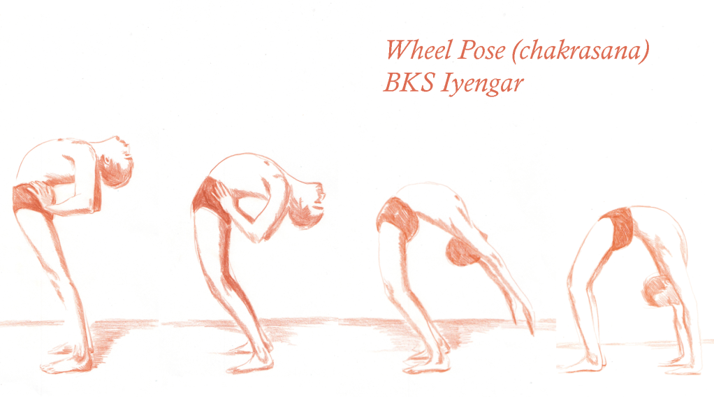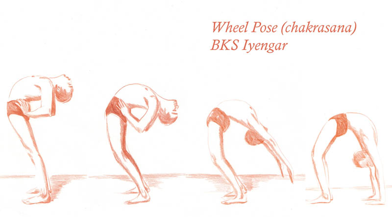 I draw Yoga poses and I also do yoga. First I began to draw because of personal interest. Then I discovered by studying and drawing pictures of yoga poses, I can develop a better unterstanding for a pose. There is a huge possibility in studying pictures for making progress in yoga. Looking at a professional pose of BKS Iyengar or Heinz Grill consciously makes you see the pose in a deeper way. Wheel Pose ist a very advanced pose. In this pictures of BKS Iyengar and Heinz Grill you can observe one very useful movement of lenghtening the spine. If you want learn this pose, it can easily happen, that you just try to bow down and loose stability and direction. But if you look at these two people, you can see, that wheel pose is created by lifting the chest upwards and lenghtening the spine. Especially this lenghening can be observed in the exercise of Heinz Grill. BKS Iyengar demonstrates the stability in the hips very well. This two movements, the stabil hold in the hips as well as the lenghtening of the spine backwards can create a new and deeper access to this posture.