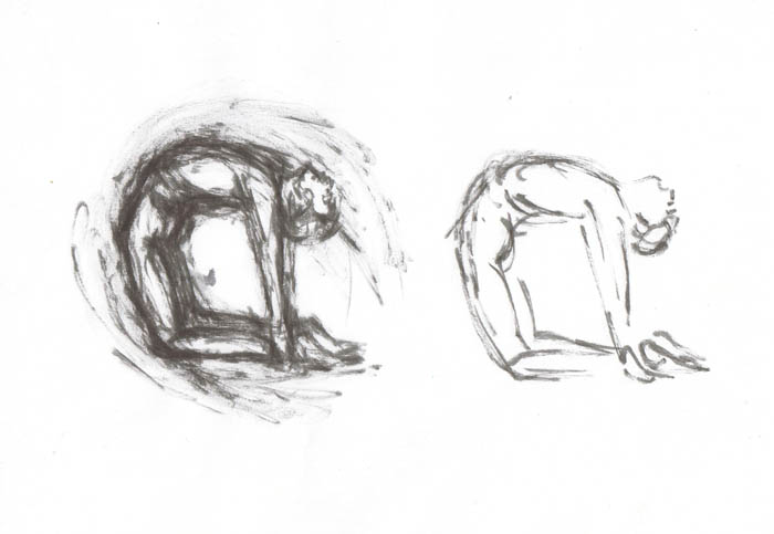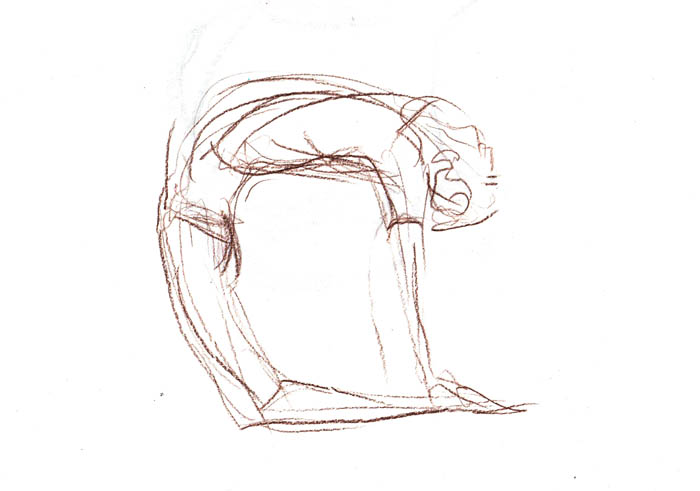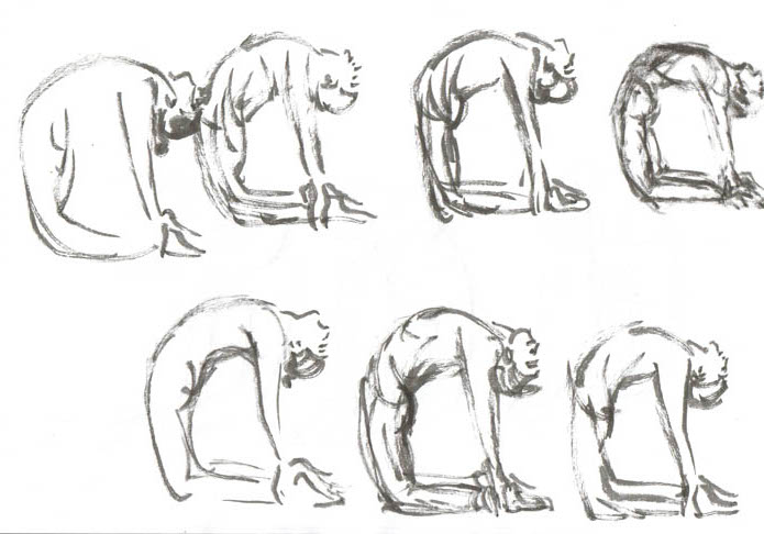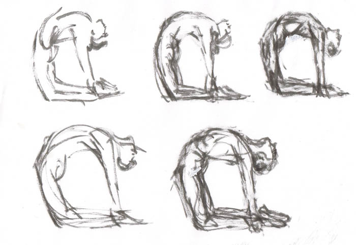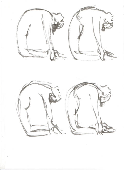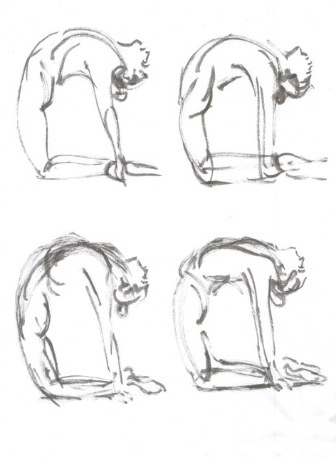 Gesture drawing means drawing out of the movement. You learn to see and feel the inner movement of a yoga pose. First you investigate the movement. Then you transform the movement you have investigated into strokes. Therefore repeating the same pose several times helps you a lot to develop the movement.