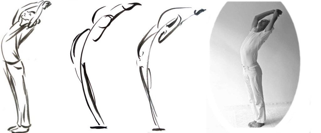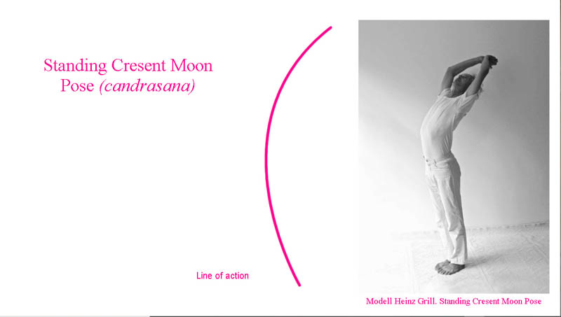 The beauty of the exercise develops by the light and elegant curved movement of the body. I´ve chosen Heinz Grill for the modell of the pose, because in his Cresent Moon Pose, you can see how he lifts up the chest. You can feel very intensely the dynamic in the middle of the spine. He lifts up the chest and centers himself in the middle of the spine and creates the dynamic curve, which expresses a movement upwards. This lifting of the chest is something very useful in yoga.