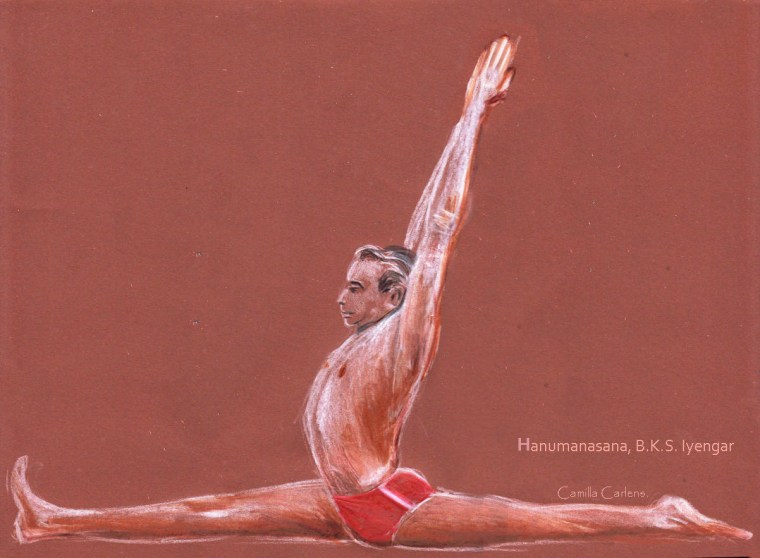 One can see straight legs, that are stretched straight in one line. Also the arms are stretched, but not out of the shoulders but out of the middle back. This straigth line expresses a force. One can see, that Iyengar does not make the exercise out of flexibility but coordinates consciously the body with own acitivity.