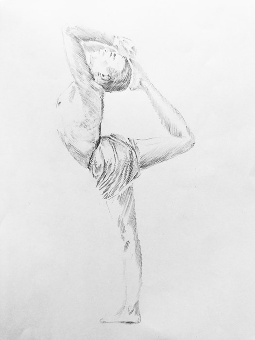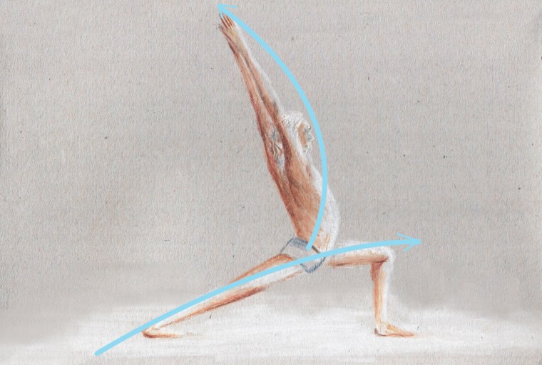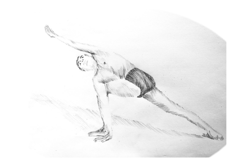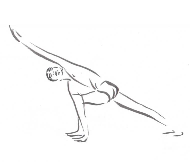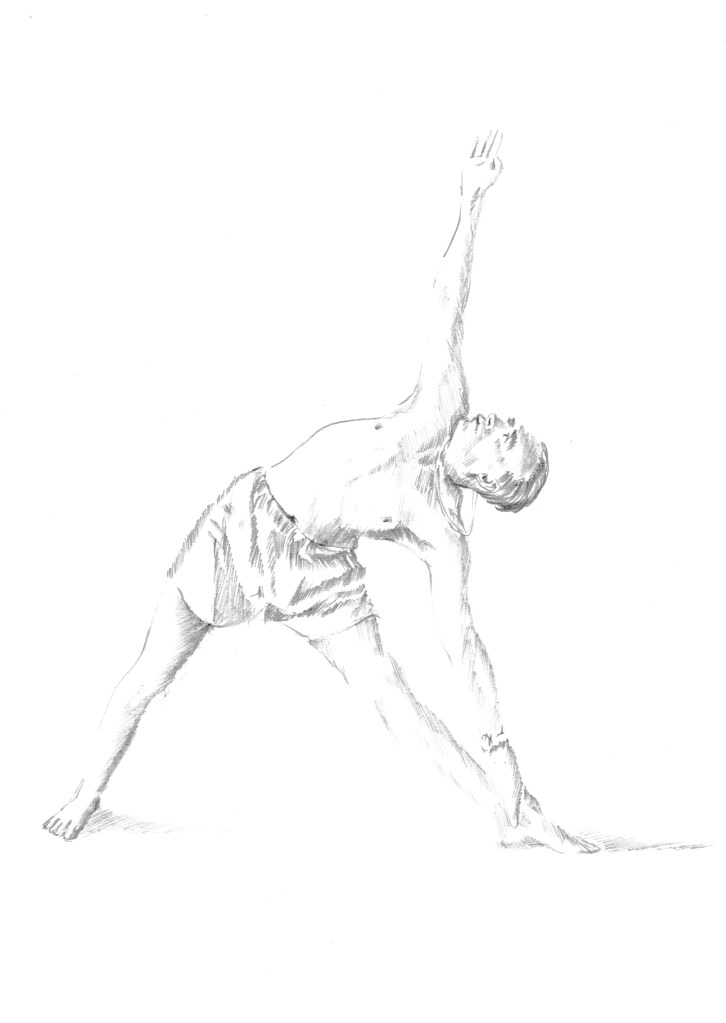 The body is exactly directed in one plane. Leg, hip, chest, head and the stretched arm shape one diagonal line, that extends upwards, as well as downwards. The following sketches shall express this diagonal line. In this pose, Iyengar expresses the feeling of extension into the space, forwards and backwards.