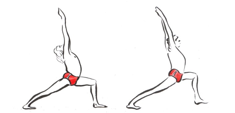 This warrior of BKS Iyengar expresses an exact direction. The body is aligned in one plane, arm, head, body, legs and feet are directed forwards. The Pose also expresses a dynamic upwards. Iyengar expresses a sens for the front and back space.