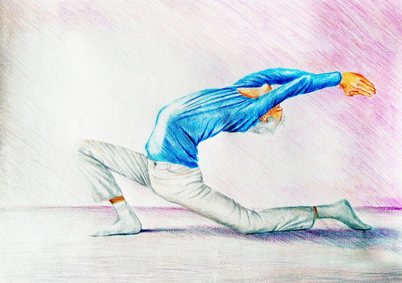 His postures express a dynamic thoracic spine in the center is always very dynamic, the pelvis stable and calm, the arms light. It gives the yoga poses a certain order and livelyness.