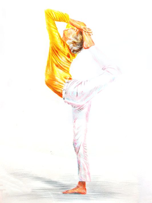 In this standing pose, the articulation of the chest, stability in the hips, and lightness in the arms shall be expressed