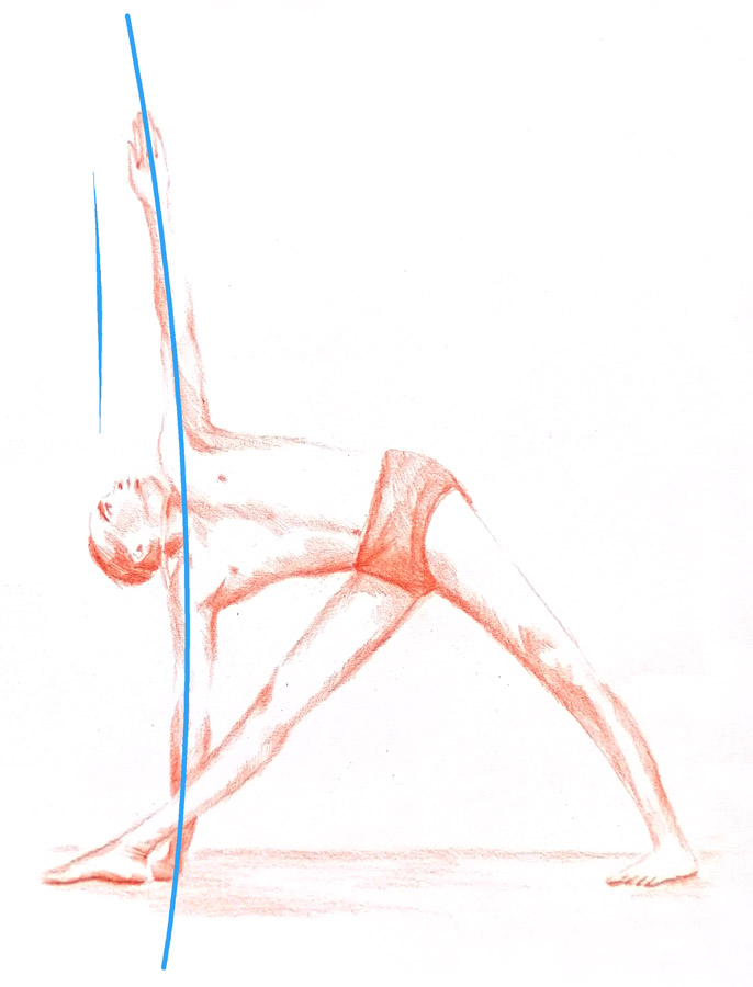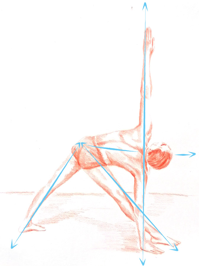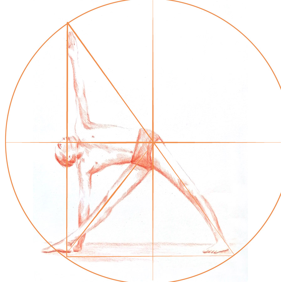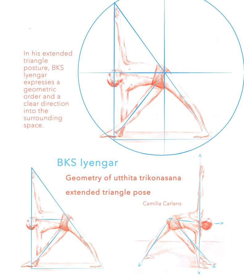 In this extended triangle pose, one can experience a clear shape as well as a directed movement. BKS Iyengar directs his body with geometric precision & creates a dynamic with his legs, arms and his spine. The feeling of lenght and width as well as order and clearlyness can be experienced by his posture.