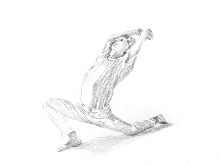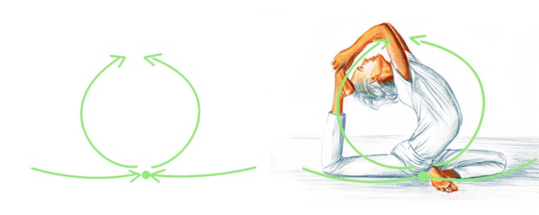 In Art, in general dynamic lines of poses are called “lines of action”. If you look at a picture, you can feel a kind of dynamic or movement – if it is expressed by the person. In this yoga pose (Anjaneyasana ) by Heinz Grill, there are two major movements or lines of action. One is concave and leads through the legs, and the other one is convex and is rising through the upper body.